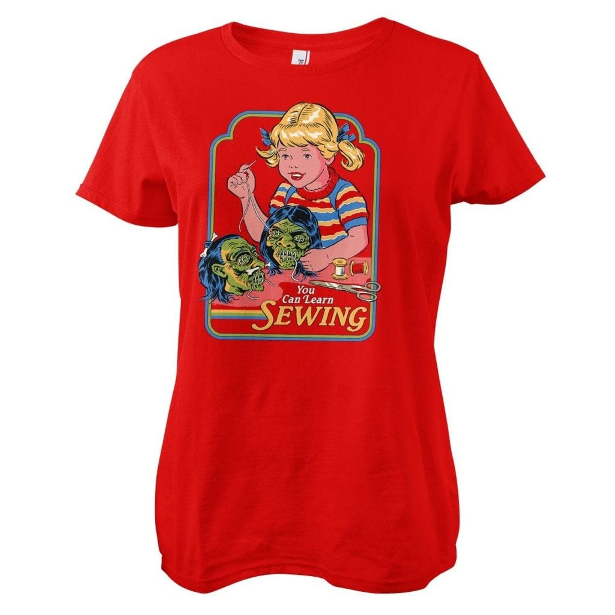 Den här T-shirten är perfekt för dig som gillar en lite galen och humoristisk look. Med motivet av en söt flicka som syr, omgiven av skrämmande zombielika huvuden, kommer du garanterat att dra till dig uppmärksamhet och skratt vart du än går.