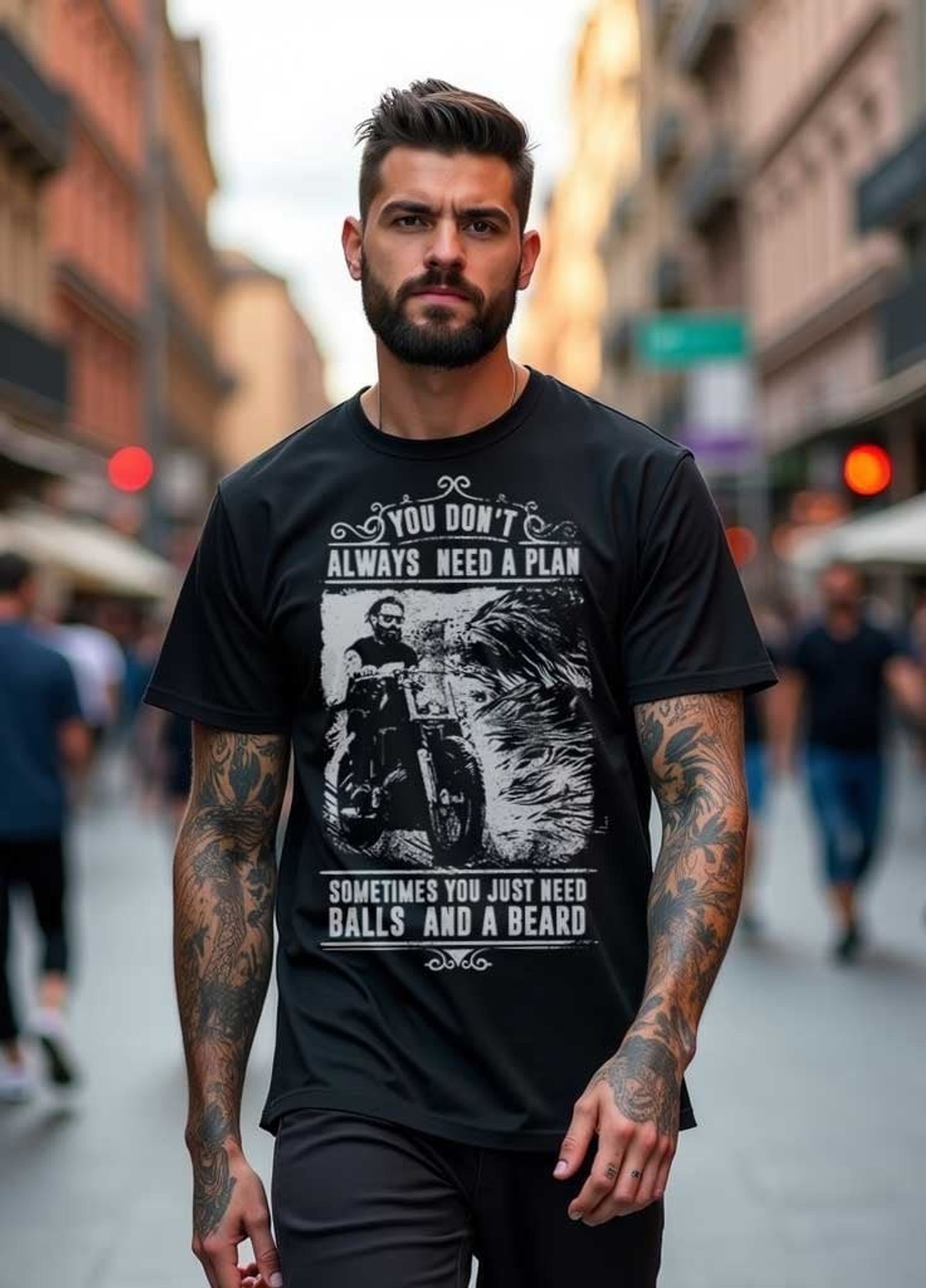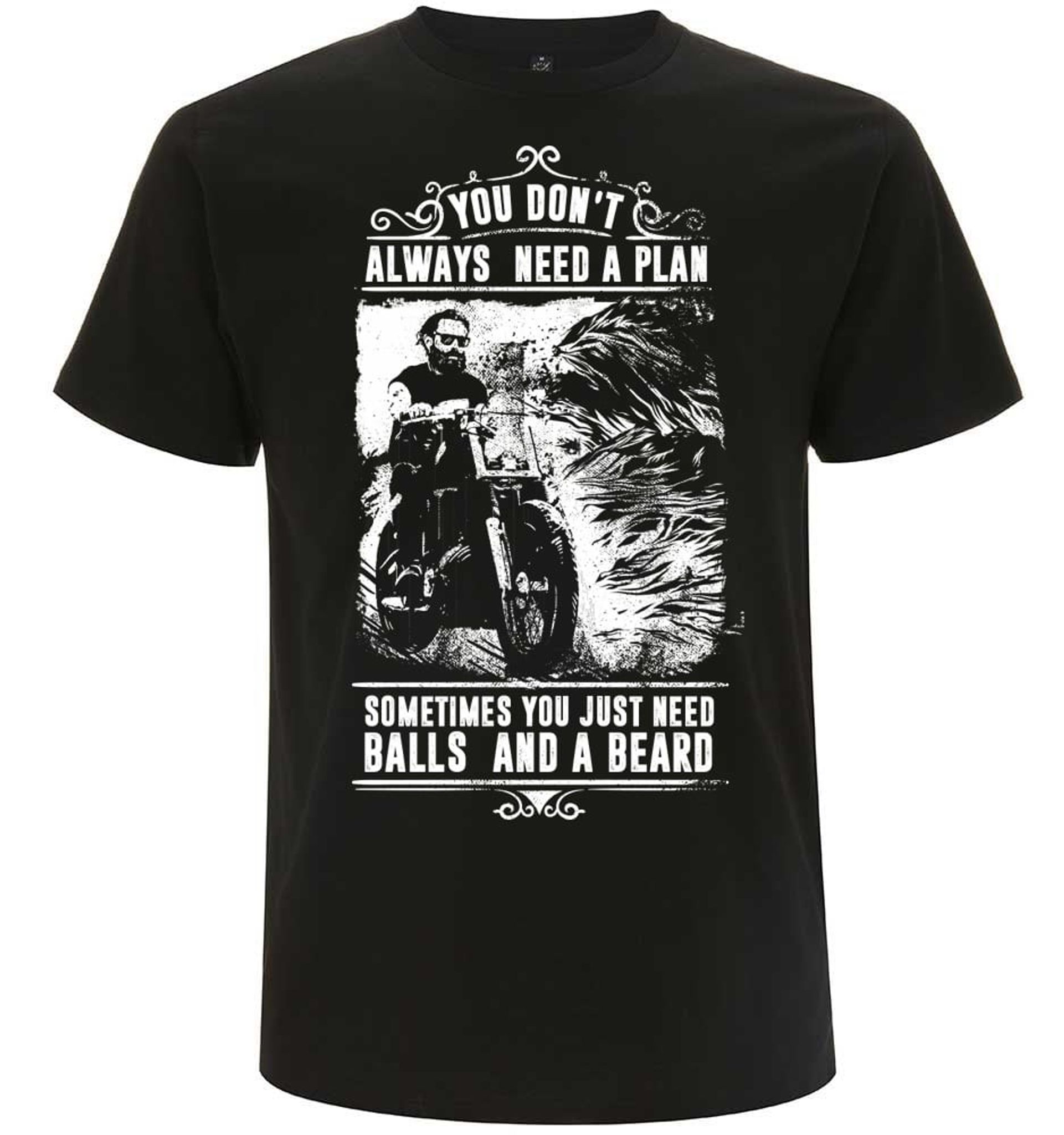You Don't Always Need A Plan T-shirt är en kraftfull och självsäker t-shirt för den som lever livet på sina egna villkor. Med ett djärvt tryck som visar en skäggig biker som stormar fram på sin motorcykel, kompletterat med budskapet "You Don't Always Need A Plan, Sometimes You Just Need Balls And A Beard", är denna t-shirt perfekt för den som värderar frihet, mod och en rejäl dos attityd.