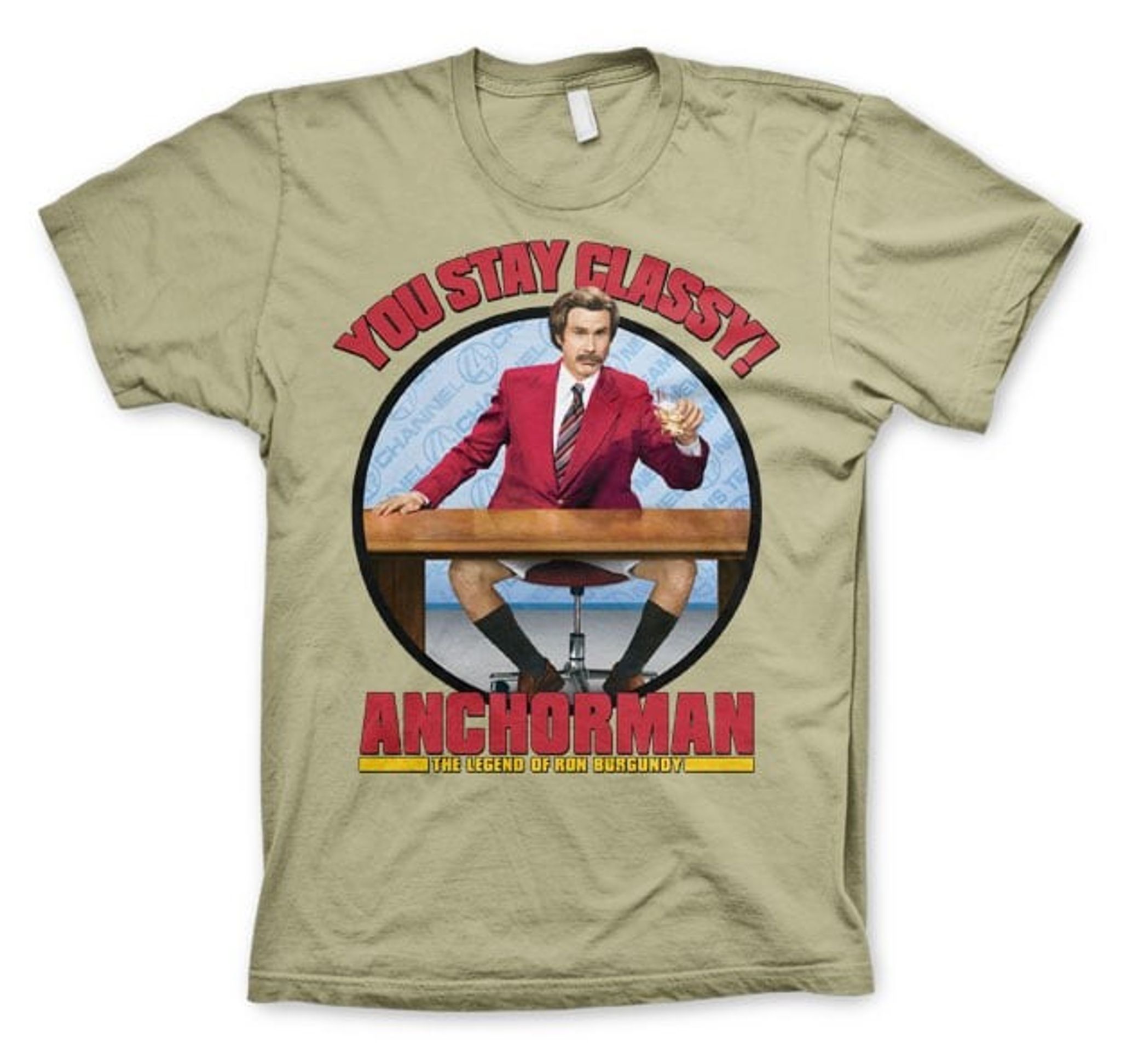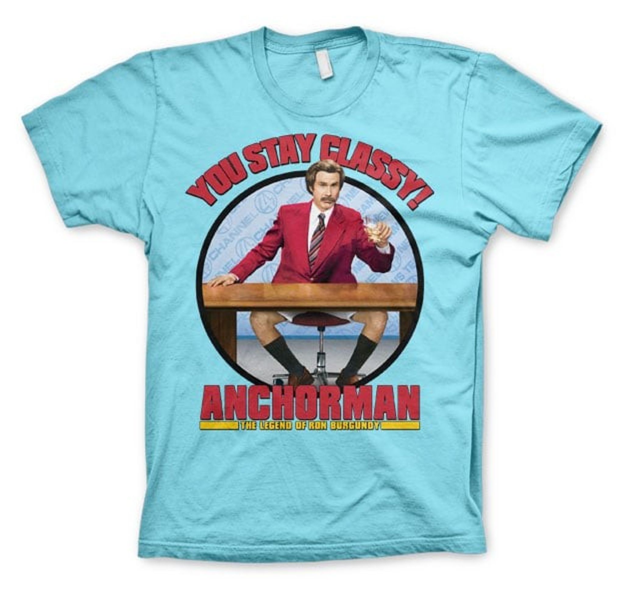 Det självklara mantrat "YOU STAY CLASSY" pryder denna t-shirt med en avbild av ingen mindre än "THE LEGEND OF RON BURGUNDY". En ikonisk karaktär vars självsäkerhet och charm har gjort honom minnesvärd för generationer. Med en 70-tals rockstjärnas hårsvall och kostym som signalerar allvar är han redo att leverera de senaste nyheterna. Med denna t-shirt blir du en del av en era då nyhetsreportage var klassiskt. Som Ron Burgundy själv skulle säga: "I'm kind of a big deal." Bli en del av legenden med denna stilfulla t-shirt.